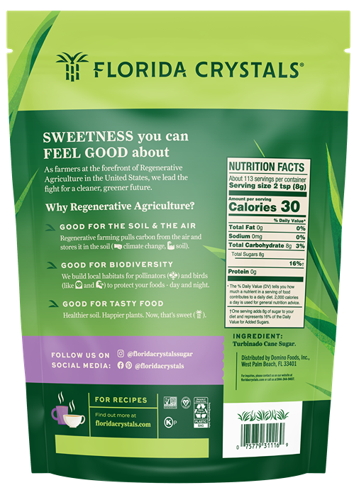 Our turbinado cane sugar is made from sugarcane grown right here in the U.S.. Sugarcane that we grow on our family-owned farms following regenerative agriculture practices.