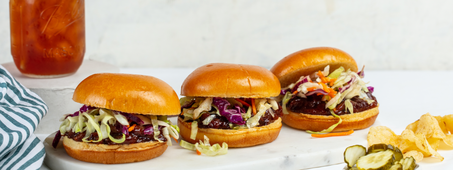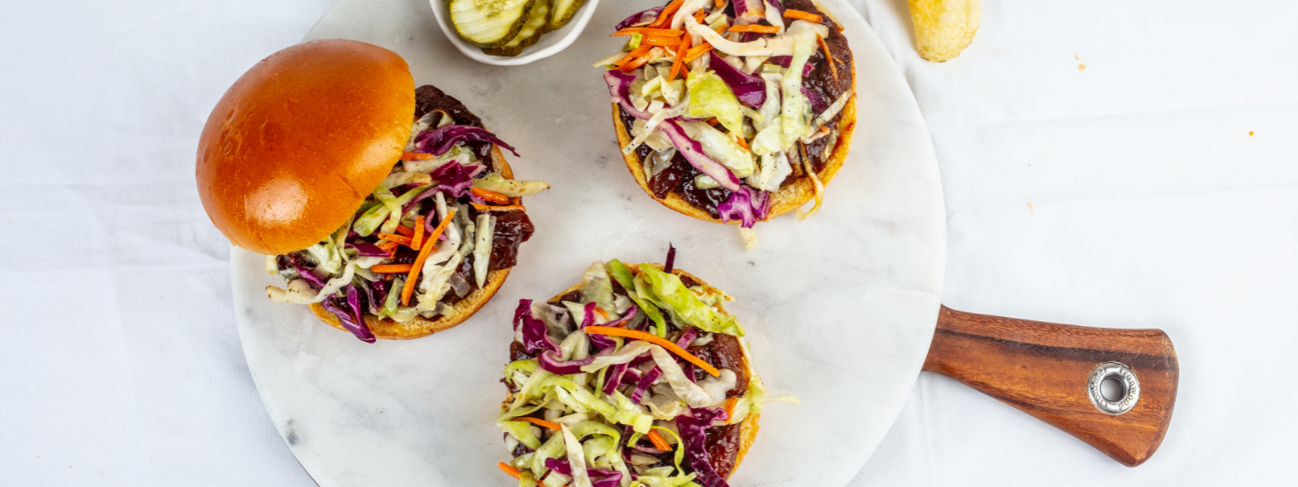 Assemble sliders. Heat slider buns, add jackfruit and slaw. Serve with a side of pickles and potato chips.