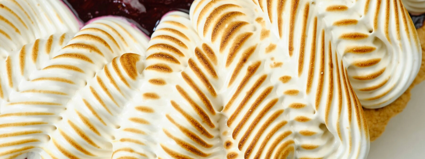 Remove the side of the pan from the bottom. The tart may be decorated on the metal bottom, or it may be transferred to a platter or plate for serving. Scrape the finished meringue into a pastry bag that is fitted with an extra-large metal piping tip called a “cake icer.” This tip has one straight side, and the other side has “teeth” to make a grooved design. With the grooved side up and holding the pastry bag at a 45-degree angle, squeeze the meringue along the edge, while moving the bag up and down slightly so the meringue folds up on itself. This will make the edge look like a ribbon of meringue around the tart. Using a small butane torch, lightly toast the meringue. This can also be done in the broiler of the oven if a torch is not available.