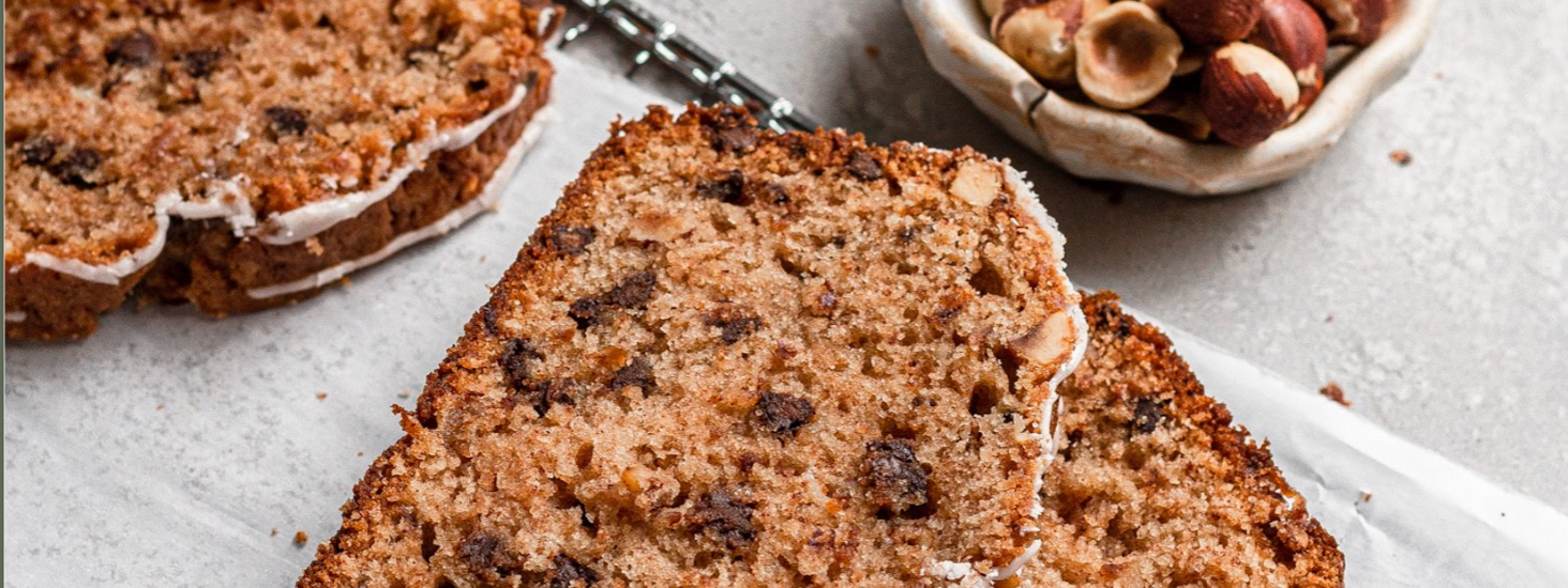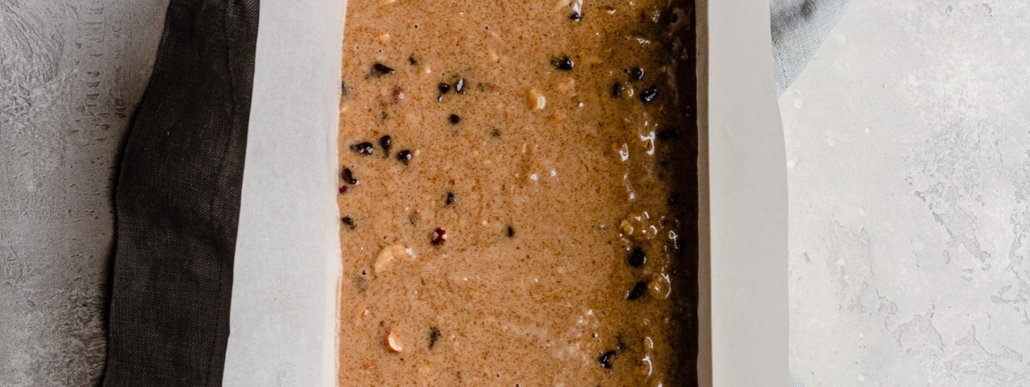 Preheat oven to 350F. Line a 9”x3” loaf pan with parchment paper and grease the parts that are exposed.