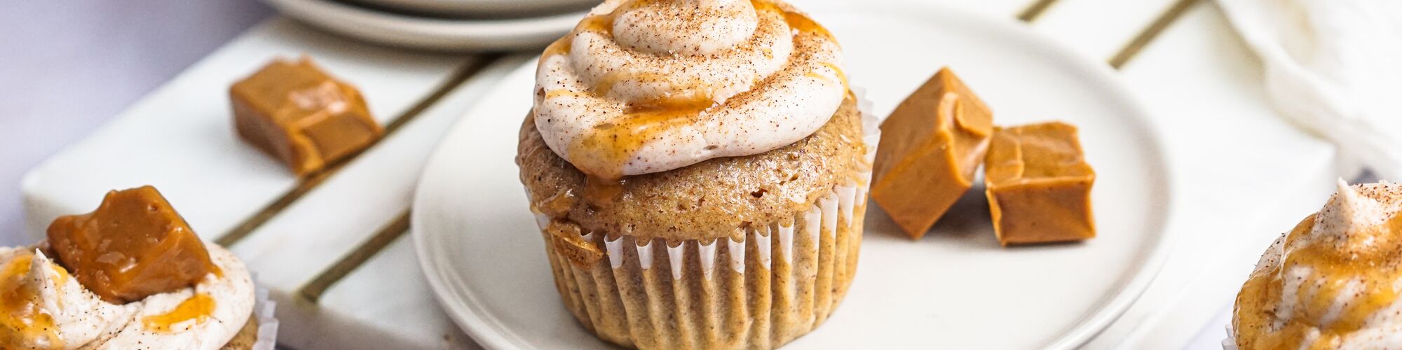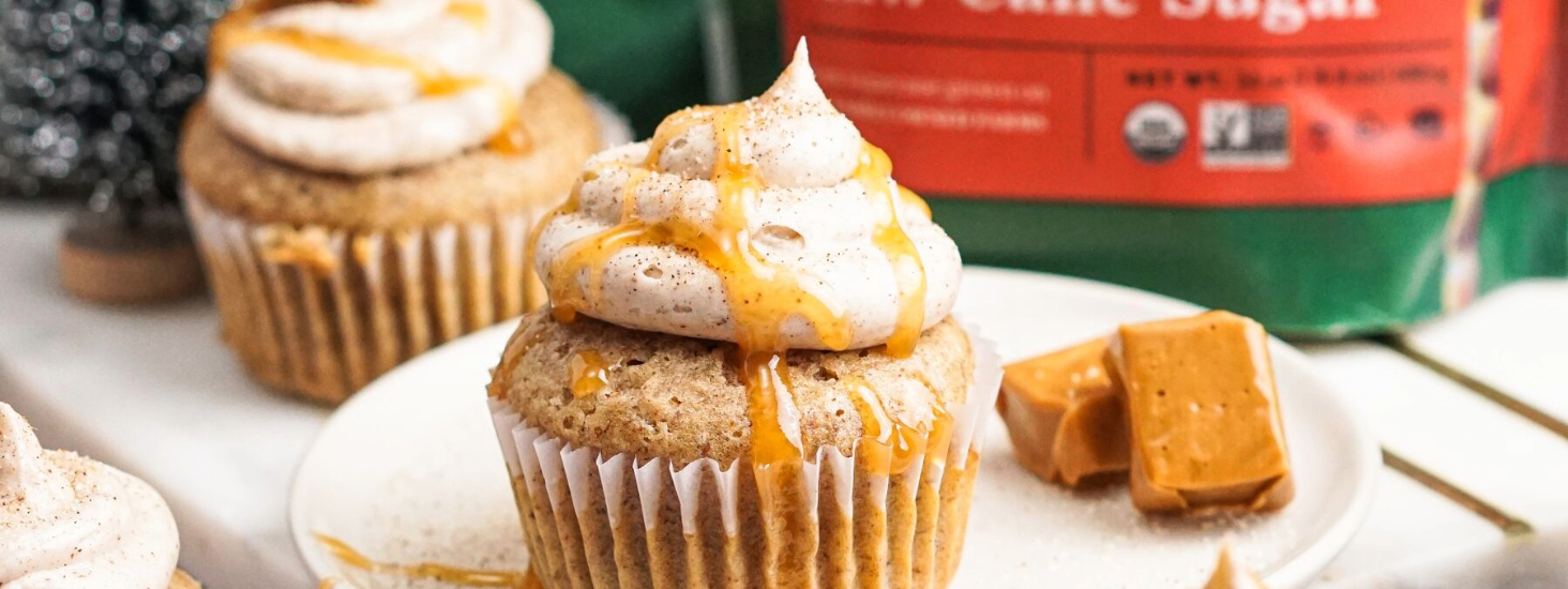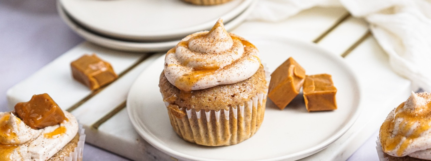 Pipe onto cupcakes, sprinkle with a little cinnamon sugar and top with a drizzle of vegan caramel fondue, if desired.