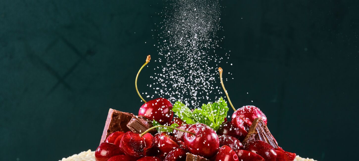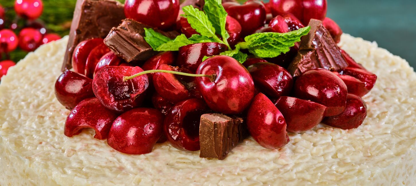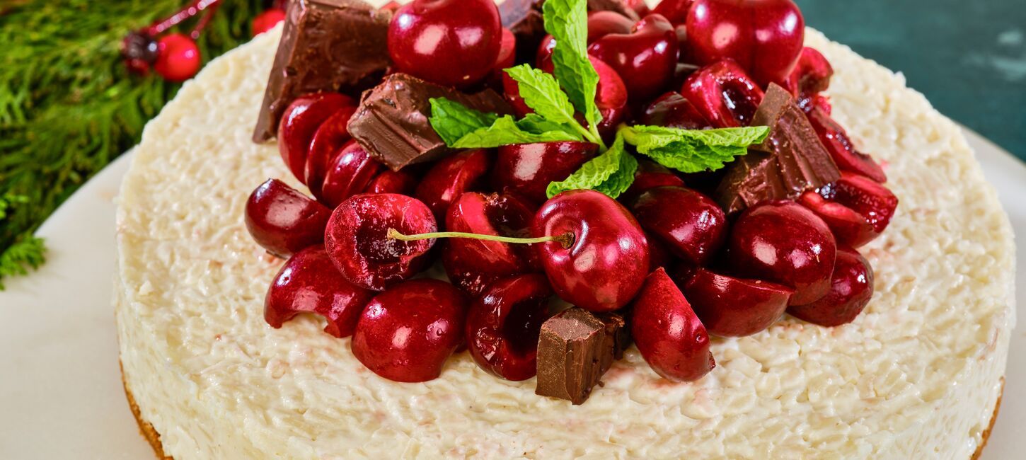 Pour the rice pudding over the prepared crust. Smooth out evenly using a spatula. Place in the refrigerator for at least 4 hours. When ready to serve, top with cherries, dark chocolate chunks, and mint.