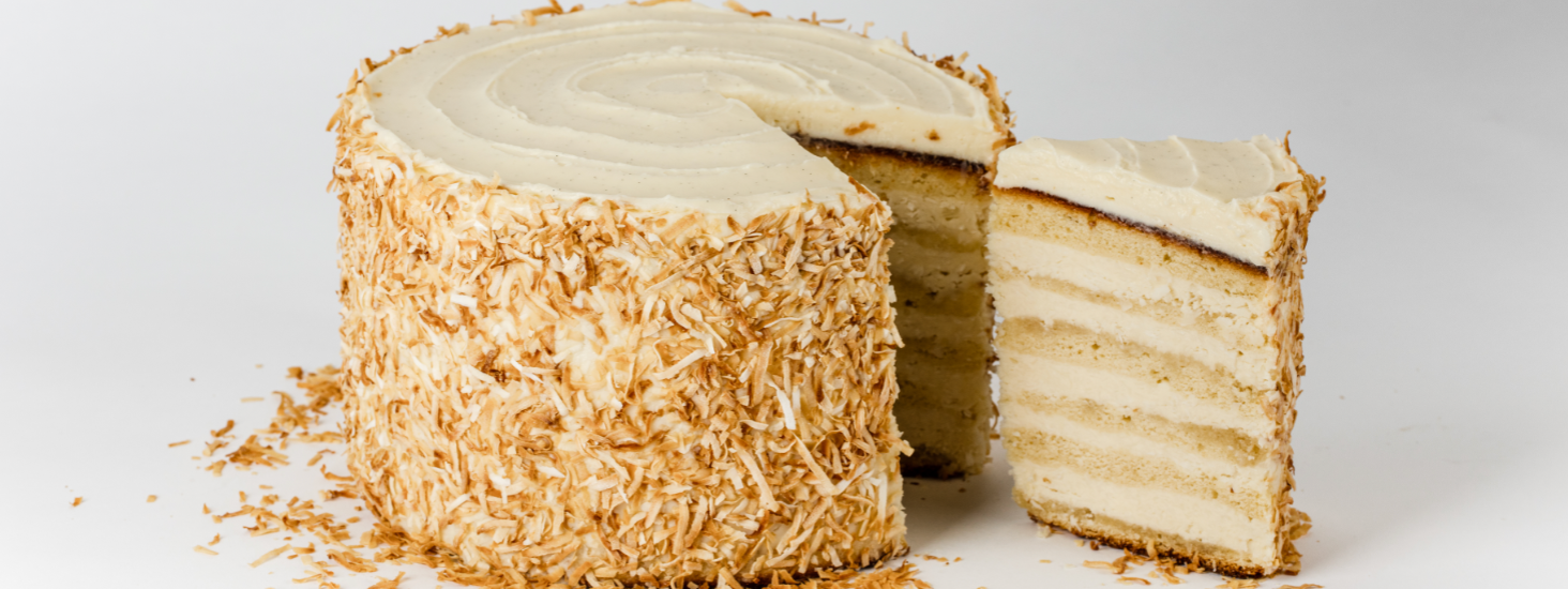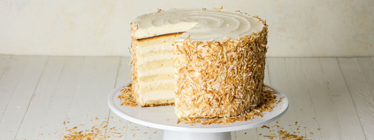Make the cake: In a large bowl, at medium speed, beat the butter and sugar together until light and fluffy, about 4-5 minutes. Add eggs, one at a time, and mix until well incorporated. Add vanilla bean paste and coconut extract. Scrape the sides of the bowl as needed.