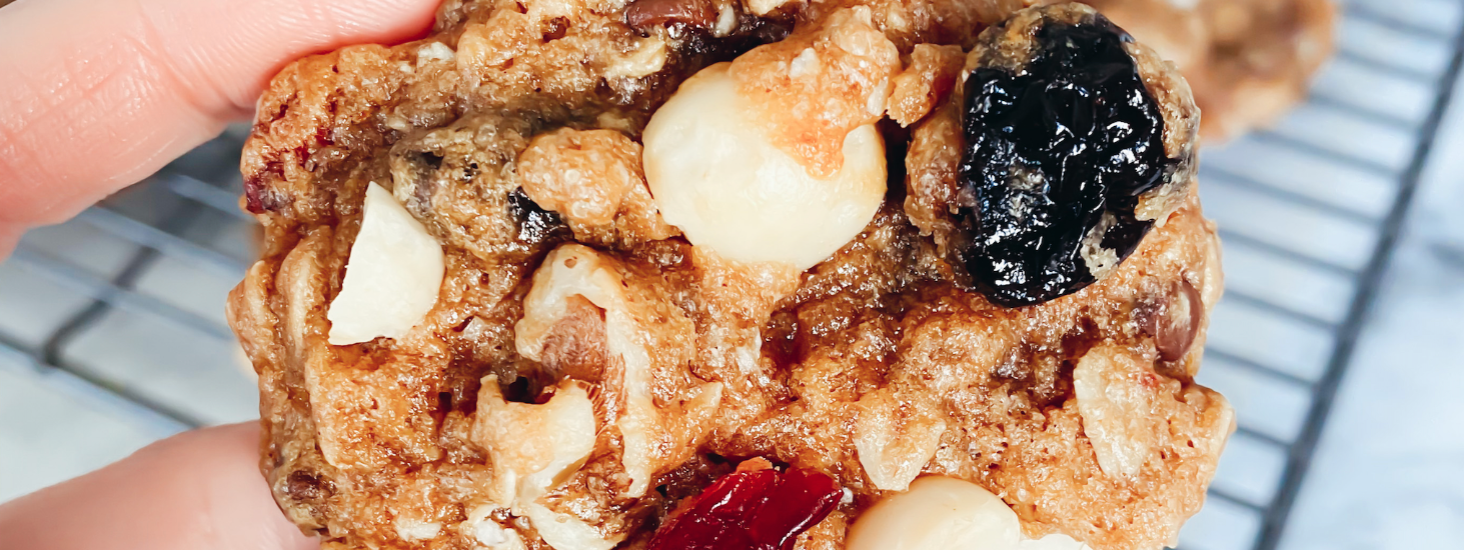 Fold in the vegan chocolate chips, macadamia nuts, craisins, dried cherries and walnuts.