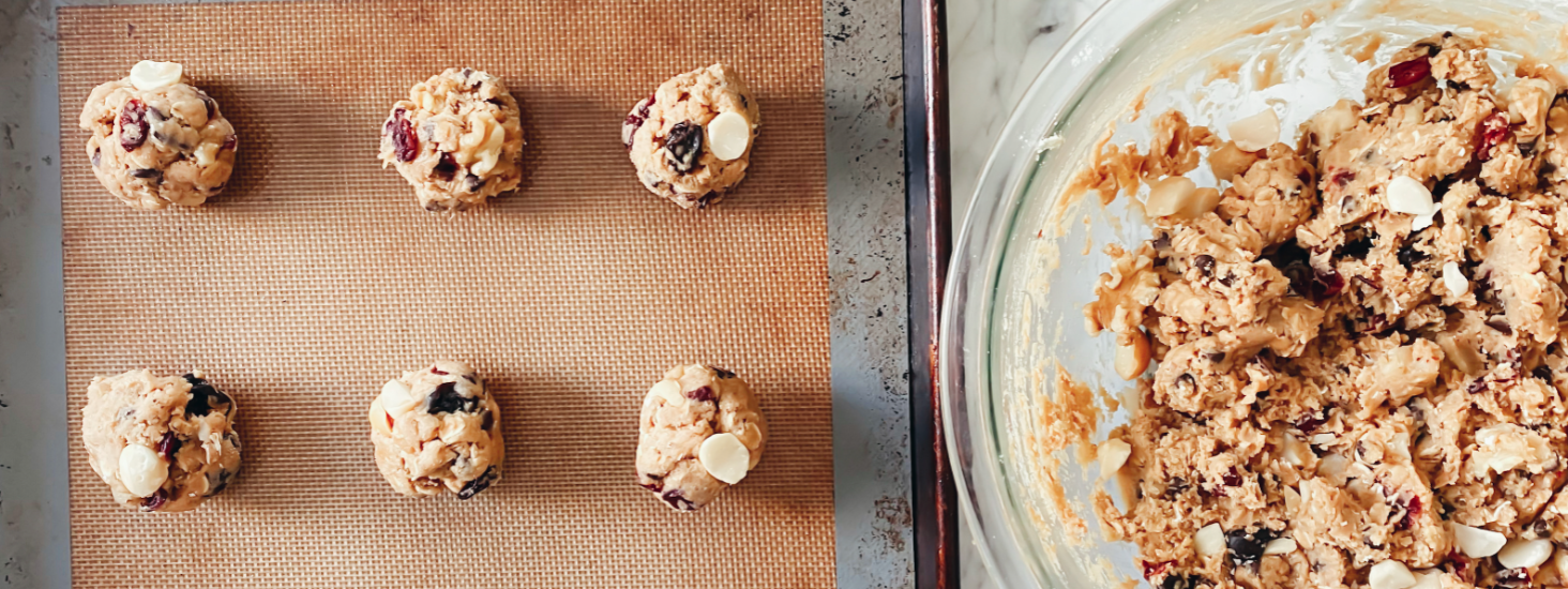 Preheat oven to 350°F and line a baking sheet with a silicone baking mat or parchment paper. Roll dough into 2 tbsp balls and place onto baking sheet 2 inches apart. You will need to bake in several batches. 6. Bake cookies for 12-13 minutes or until edges are golden.