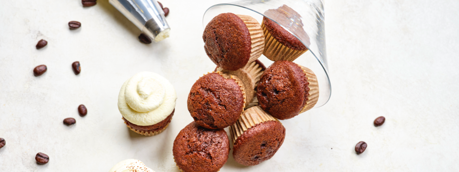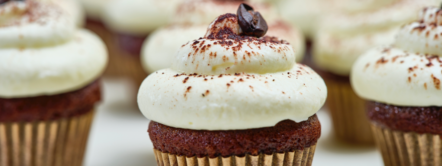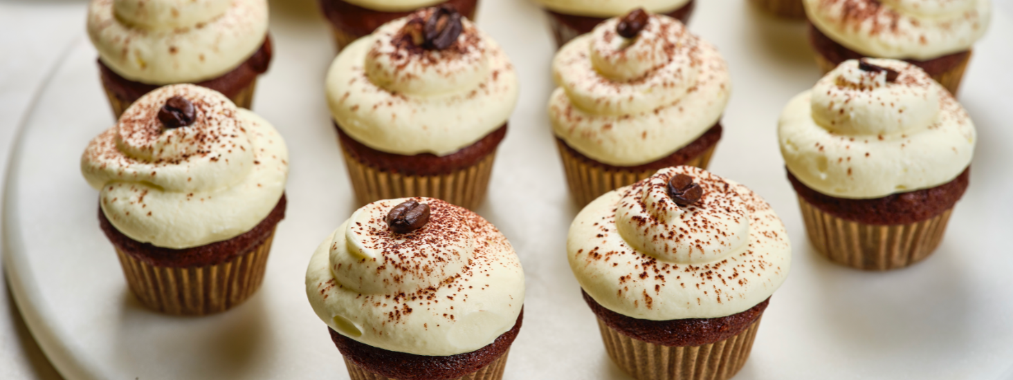 For the frosting, beat at medium speed, the mascarpone cheese, sugar, and vanilla until well combined. Scrape the sides of the bowl. Slowly add the cream and beat at medium speed until soft and spreadable consistency. Add the frosting to a pastry bag fitted with a round decorating tip. Top the cupcakes with frosting and sprinkle cocoa powder on top. Finish with one or two whole coffee beans on top as garnish.