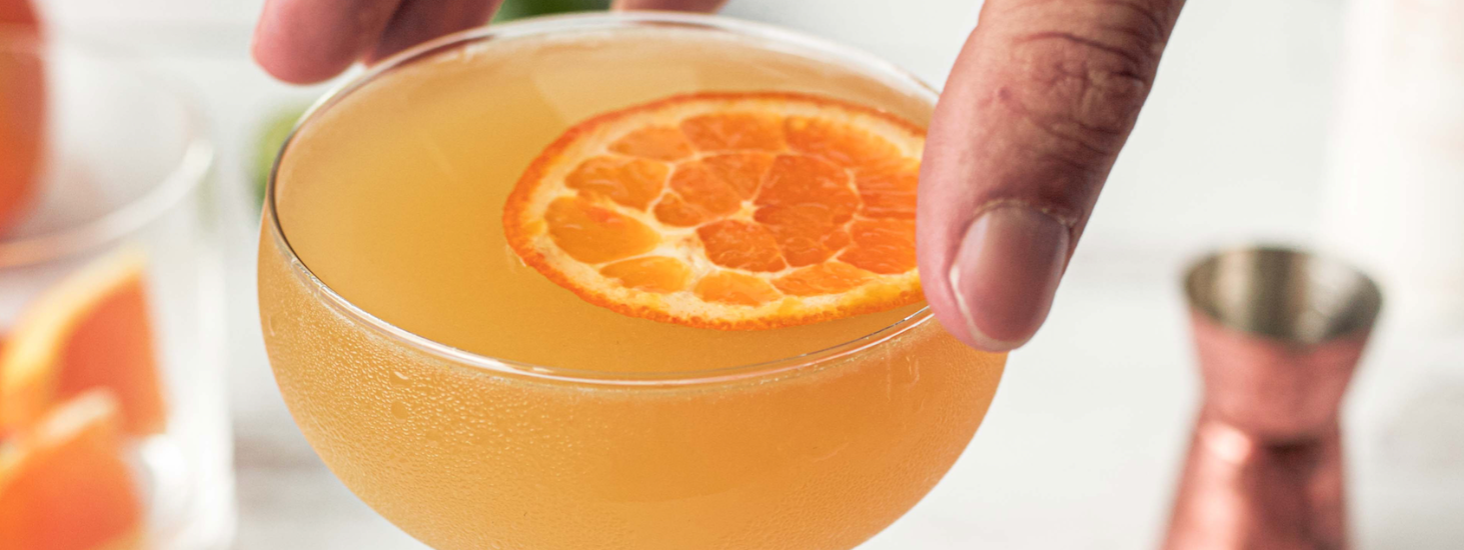 Garnish the cocktail with three drops of orange bitters and a thinly sliced orange wheel or orange twist.