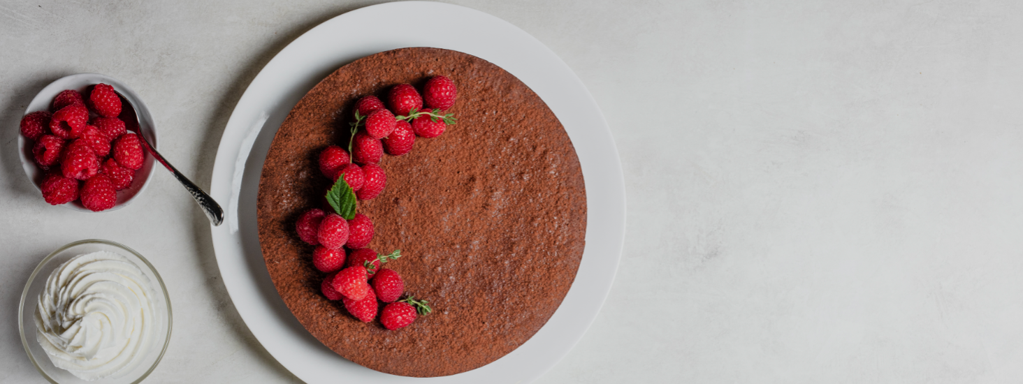 Wrap the springform pan with aluminum foil and place in a large roasting pan. Pour the batter into the prepared pan and smooth the surface with an offset spatula. Place the roasting pan in the oven and add hot water to come up 1-inch of the spring form pan. Bake for 40-45 minutes or until the center is set. Do not overbake. Remove from oven and allow the cake to cool down to room temperature. Refrigerate for at least 6 hours or overnight. Run a sharp knife around the sides of pan. Remove from pan. Dust with cocoa powder and decorate with fresh raspberries and thyme sprigs. Serve.