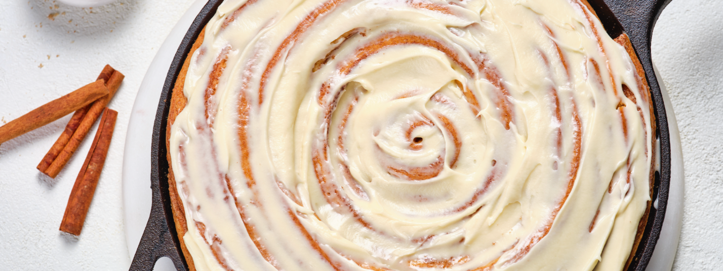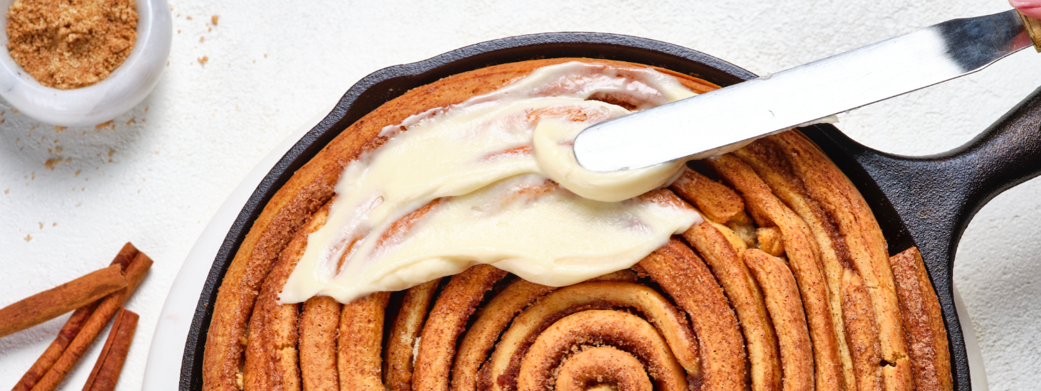 Using a pastry cutter or sharp knife, cut the dough into eight 2-inch wide strips. Roll one piece and set it in the middle of the skillet. Loosely roll up the rest of the strips into a coil forming the giant roll. Make sure the dough is not coiled too tight as the dough needs room to expand.