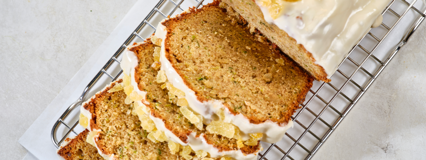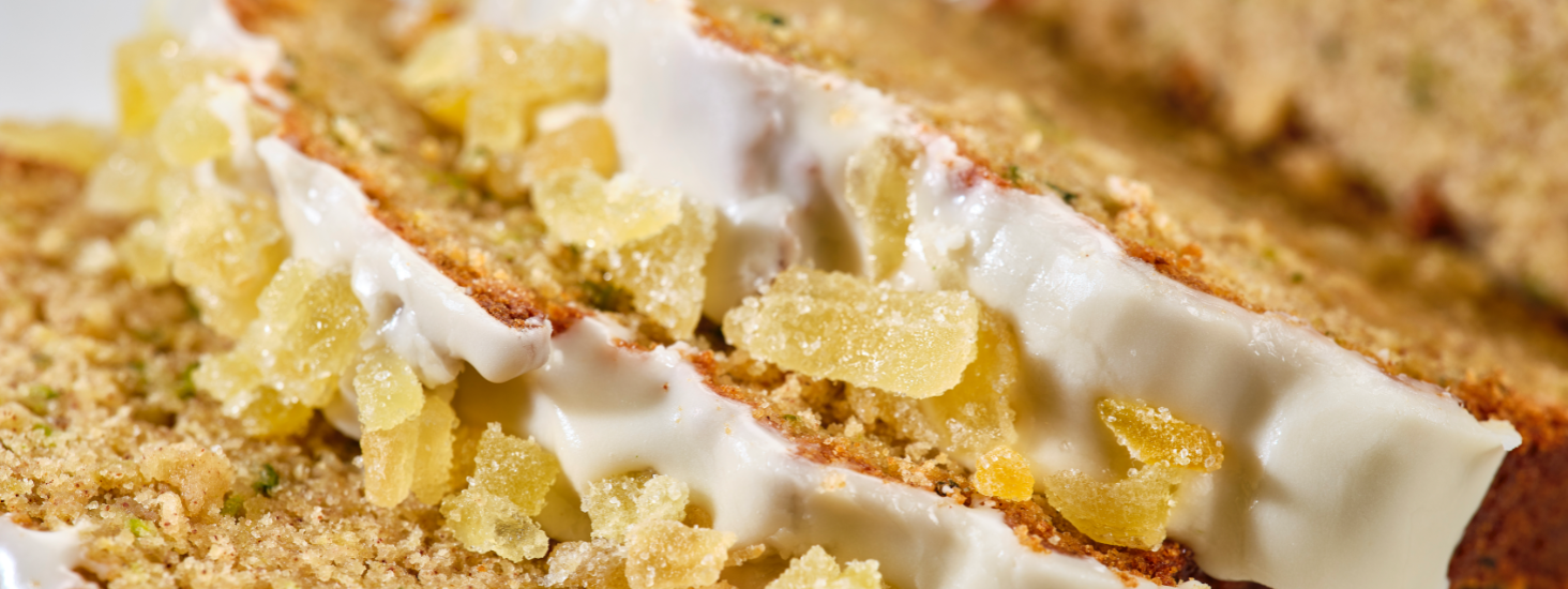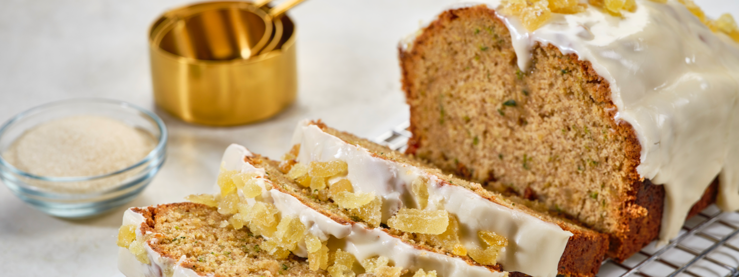 Once the bread is cool, remove from pan and set onto serving plate. Pour the glaze on top and some may drizzle down the sides. Garnish with chopped crystalized ginger(if desired).