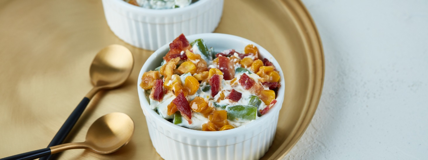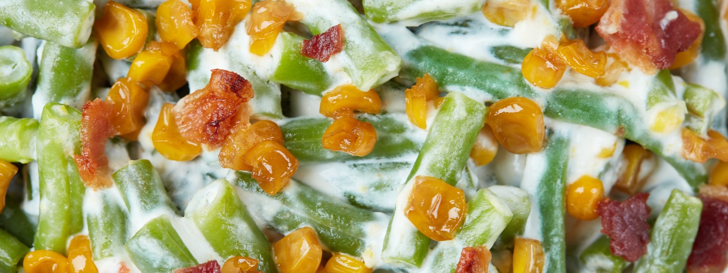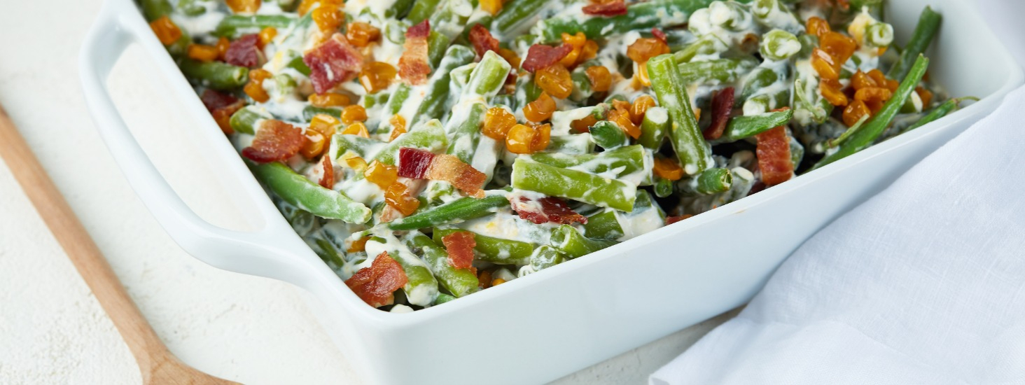 Turn green bean mixture into prepared dish, lightly tent with foil, and bake 20-25 minutes or until hot and bubbly. Uncover casserole, top with candied corn and bacon, and return to bake an additional 5 minutes to crisp bacon. Serve hot.