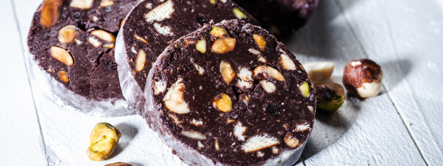 Add 1 ½ cups of sugar, cocoa powder, port wine, vanilla, and salt. Mix at low speed until combined. Add cookies, pistachios, hazelnuts, and dried cherries. Mix at low speed until just combined.