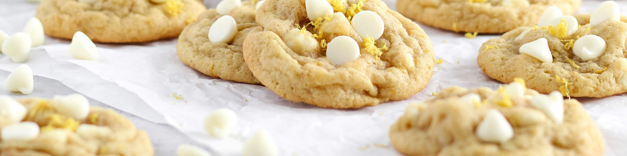 For extra round cookies, use the back of a spoon to gently shape each cookie immediately after pulling them out of the oven. And then immediately top each cookie with a few white chocolate chips.