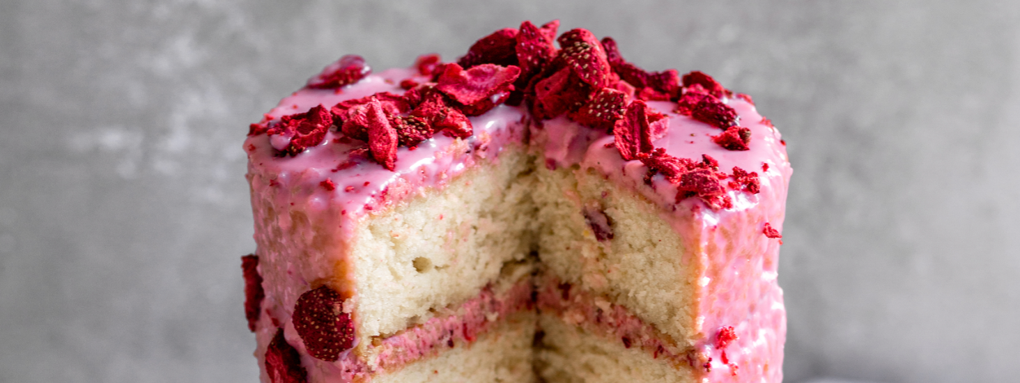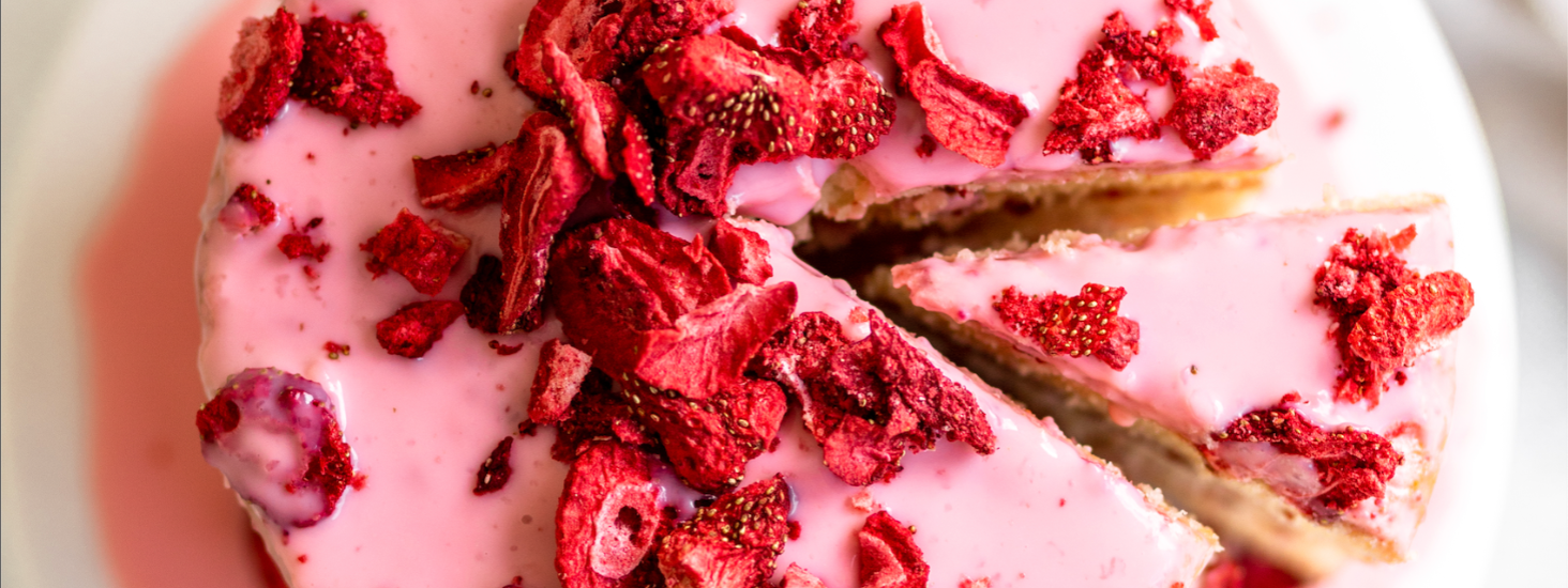 Wrap a sheet of clear acetate around the cake, securing it with tape. It should look like a tube around the cake. When the frosting has completely cooled, pour the frosting onto the cake (in the middle of the tube) making sure that none seeps through the sides. Sprinkle with more freeze-dried strawberries. When you’re ready to reveal, loosen the acetate and pull up. Watch the frosting fall!