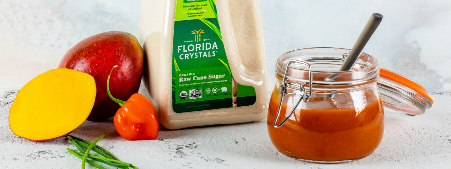 Heat oil over medium heat in a medium saucepan. Add onion and cook until it becomes translucent, about 5 minutes. Add garlic and mangoes and cook for 3 minutes. Stirring occasionally. Add mango juice, Florida Crystals® Regenerative Organic Raw Cane Sugar, vinegar, salt, mustard, ginger, pepper, and habanero peppers. Bring the mixture to a boil. Reduce the heat and simmer the mixture for about 30 minutes or until sauce has slightly thickened.