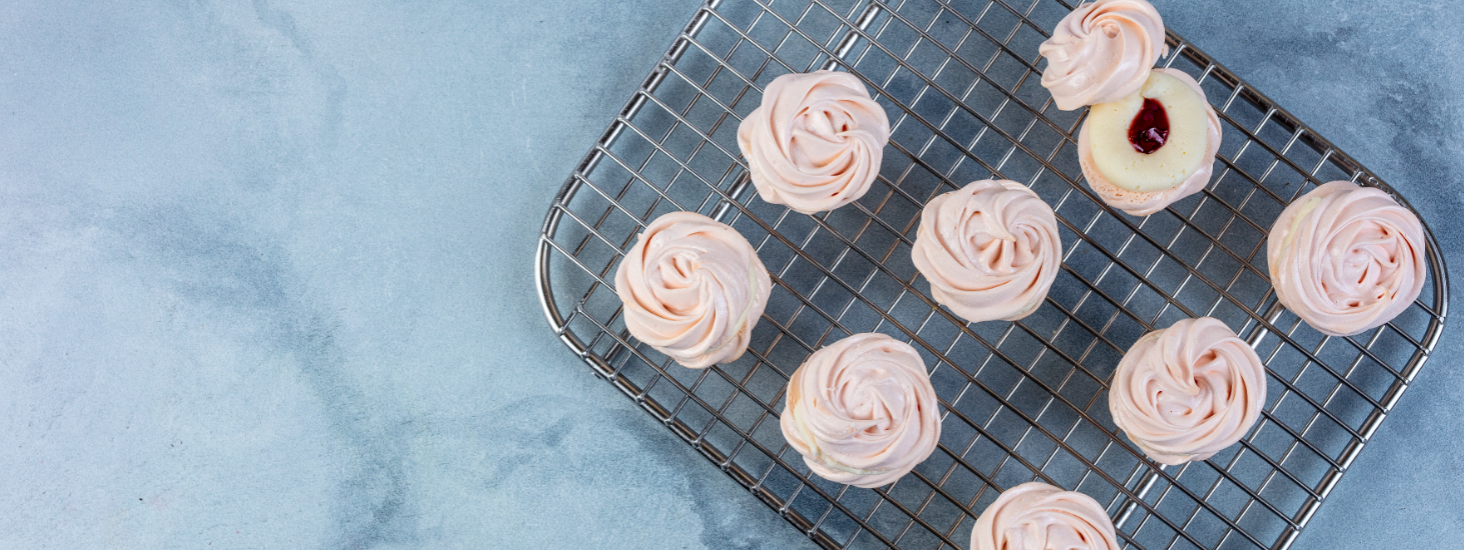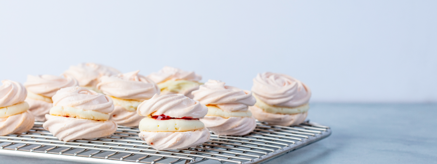 Remove meringues from pan and pipe cream cheese frosting onto a meringue cookie. At the center, add a little of strawberry preserves. Cover with another cookie, creating a sandwich.