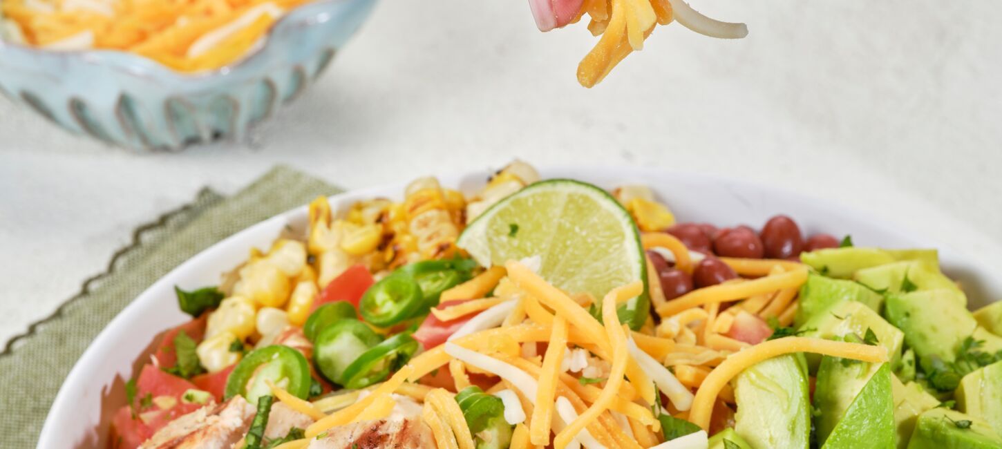 Assemble the bowls. In four bowls, divide the rice. Arrange the chicken, black beans, corn, Pico de Gallo, and avocado around the plate. Top with cheese and serrano peppers. Serve immediately with sliced radishes, lime wedges, and cilantro lime dressing.