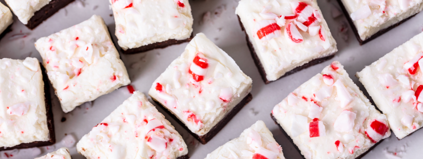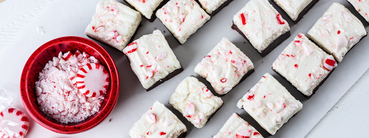 Prepare the white chocolate peppermint layer. In a large heatproof bowl, combine white chocolate and butter. Fill a saucepan with water, about ¼ full and bring to a boil. Reduce heat and bring water to a simmer. Place the bowl on top of the saucepan and mix until chocolate melts and the mixture is smooth. Remove from heat. Add sugar, peppermint extract, and salt. Mix with a wooden spoon until smooth and well combined. Spread on top of the dark chocolate layer. Sprinkle with crushed peppermint candy.