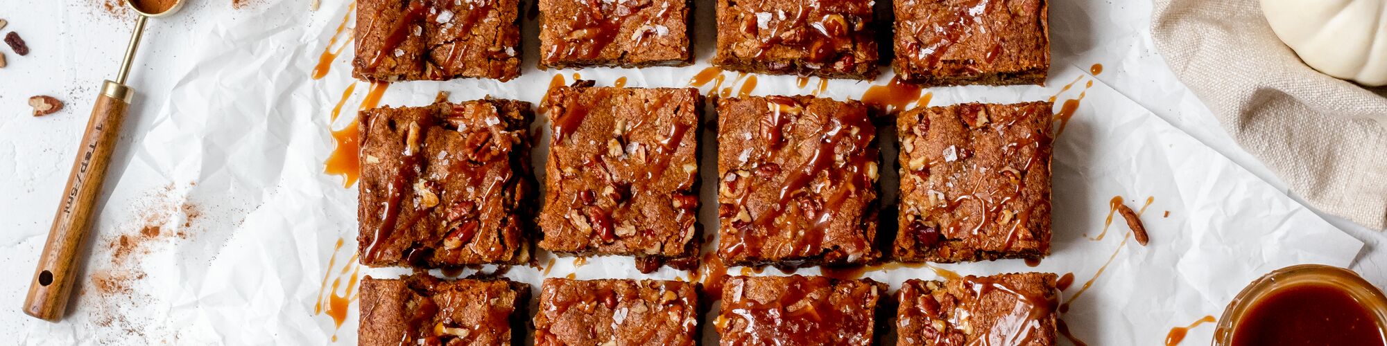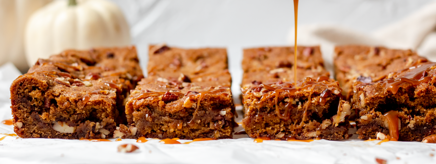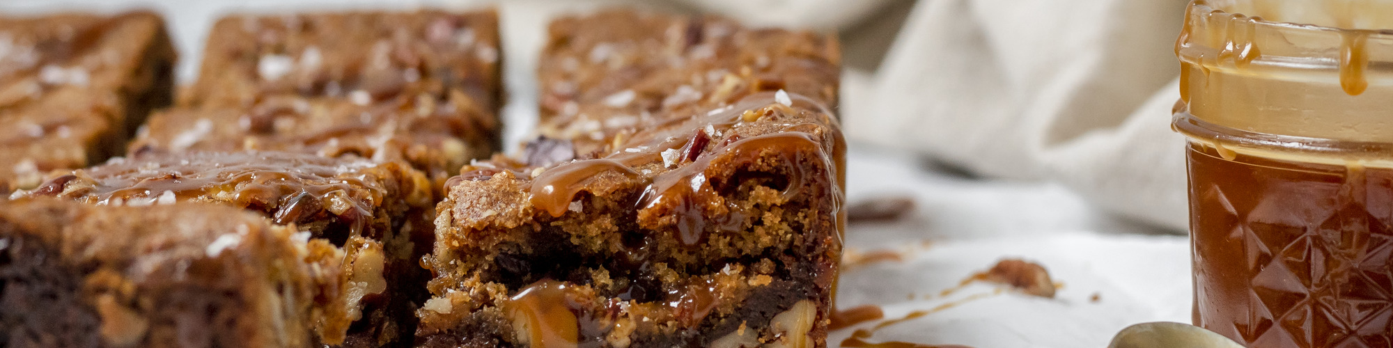 Scoop the remaining dough on top of the caramel layer and press down into an even layer. Drizzle a bit of extra caramel and pecans over the top.