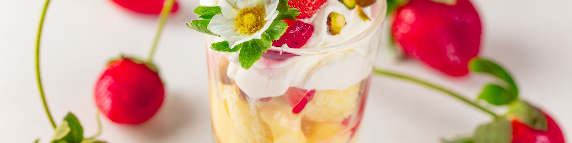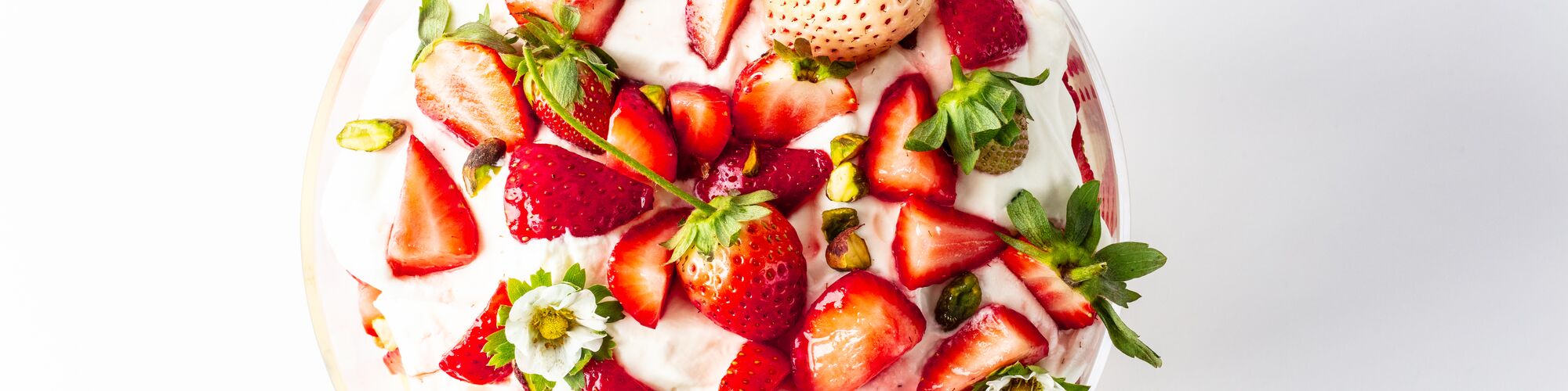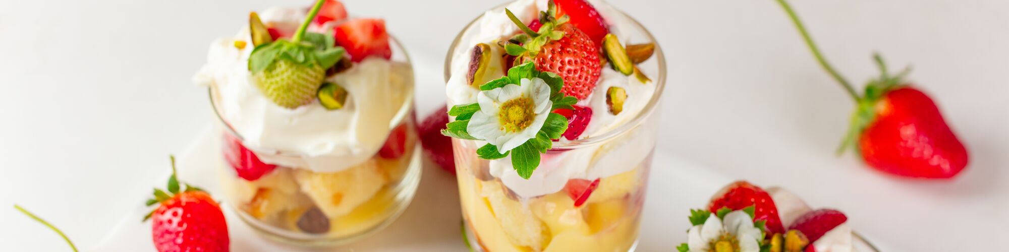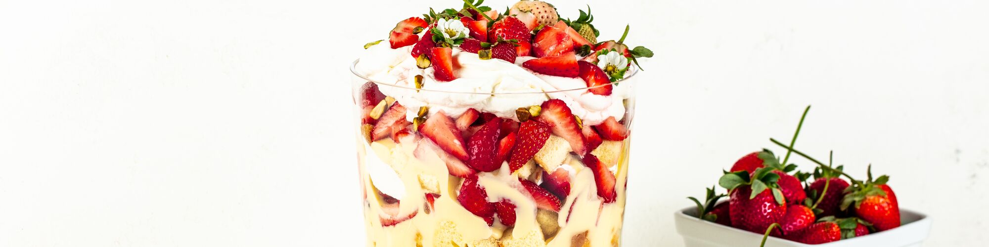 Assemble the trifle. Place a layer of pound cake at the bottom of a trifle bowl. Top with a layer of strawberries. Add some of the juices released by the strawberries. Sprinkle pistachios on top. Add a layer of pastry cream and then a layer of whipped cream. Repeat the process of layering ending with whipped cream.
