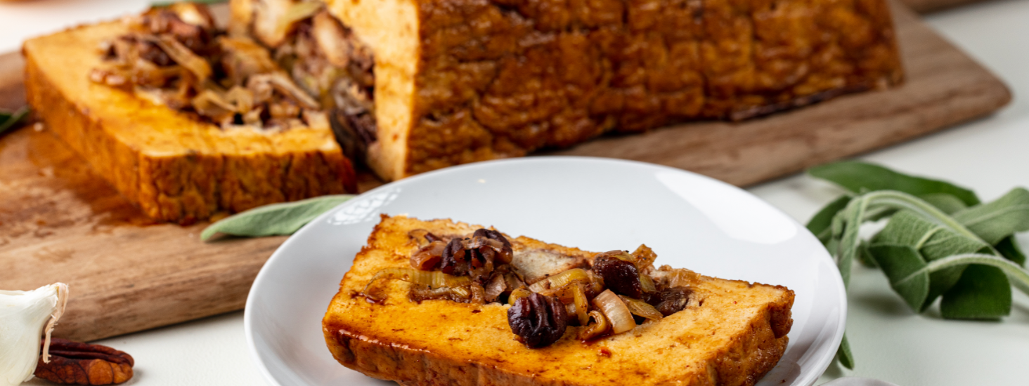 Add two thirds of the tofu mixture to the prepared pan. Press firmly creating a well with 1-inch walls around. Add the stuffing to the well, the gently press the remaining tofu on top.