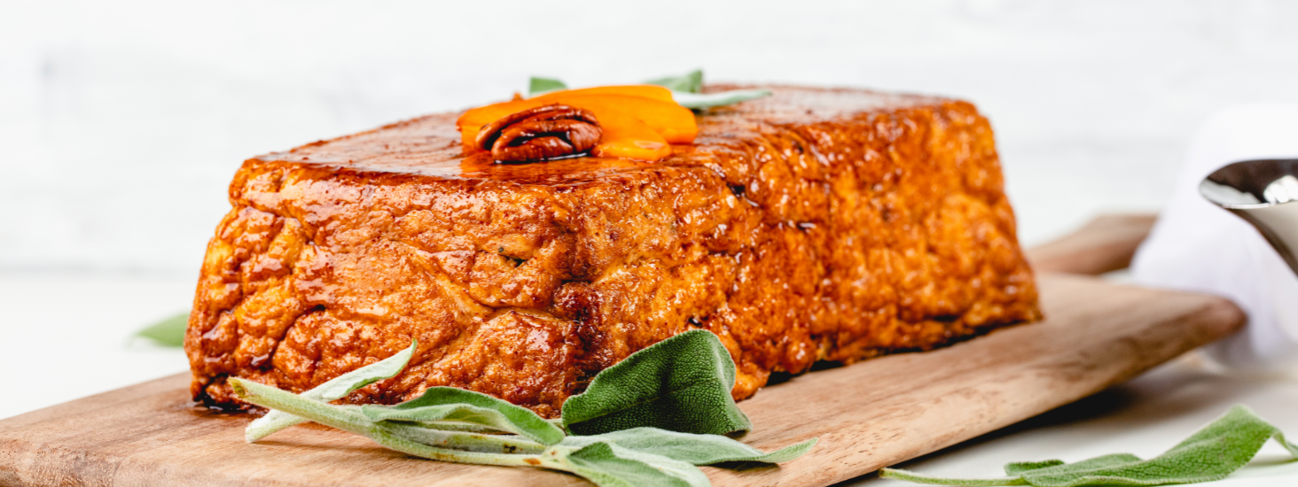 Remove from the oven and carefully invert tofurkey onto a baking sheet lined with aluminum paper. Brush with glaze and bake for 10 minutes. Remove from the oven and glaze again. Serve hot.