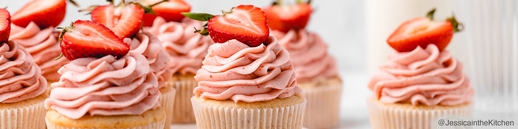 Frost the top of each cupcake using a pastry bag filled with a large open-star tip. Garnish with fresh strawberries.