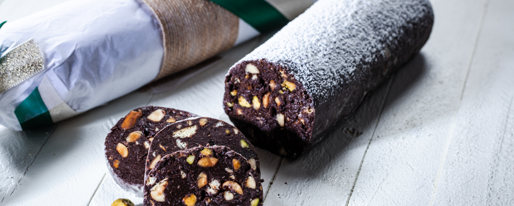 Your quest for wrapping and packing materials need not end with paper alone. Fabric can be purchased inexpensively at arts & crafts stores or, even better, repurposed from items donated to thrift stores. From a funky, retro dress to a sophisticated scarf, color and pattern options are endless. You can also slice strips of things like drapes or tablecloths into decorative ribbons and bows. Consider using thin strips of brown fabric to stand in as a creative twist (literally) on baker’s twine when packaging our unique Hazelnut Pistachio Chocolate Salami or wrapping the entire “salami” in a stiff white canvas to represent deli paper, keeping with the theme in a sustainable way. The possibilities are endless, so, whether you’re sending a store-bought present or a homemade one, think about surrounding your gifts with a little bit of style this season and making fabric your choice for festivity this holiday season. Mother Nature and all her friends, like me, will thank you.